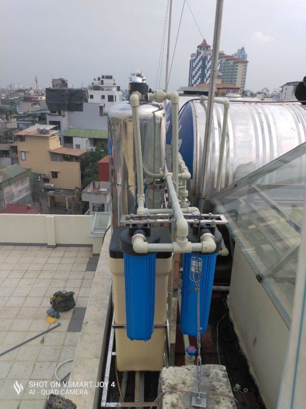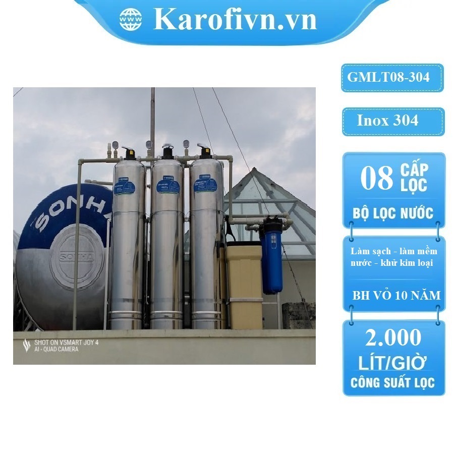 hệ thống gồm 8 cấp lọc, cột lọc Inox 304 không gỉ , Khung Inox, Lọc thô béo, Thùng muối hoàn nguyên.