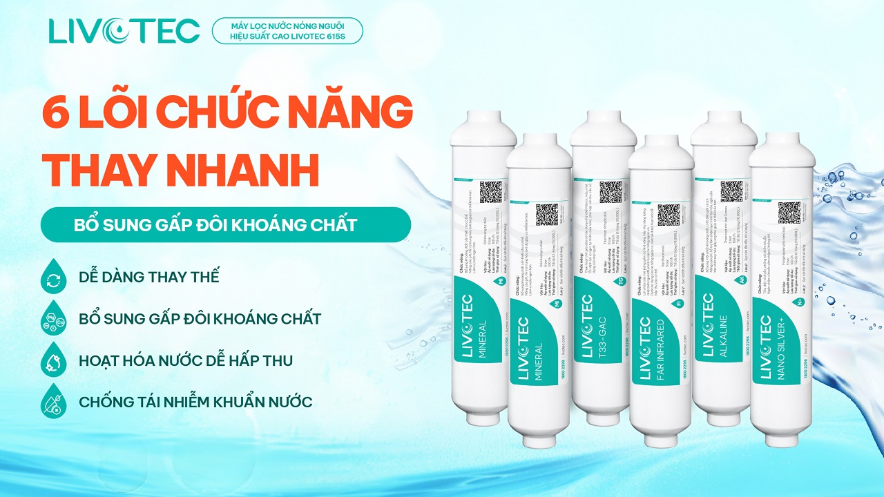 Máy lọc nước nóng nguội Livotec 615S sở hữu 6 lõi chức năng thay nhanh: 2 lõi Mineral, T33-GAC, Alkaline, Far-infrared, Nano Silver; giúp tăng gấp đôi hàm lượng vi khoáng có lợi cho cơ thể, chống tái nhiễm khuẩn nước, ổn định vị ngon ngọt tự nhiên đồng thời hỗ trợ trung hòa axit dư giúp cơ thể khỏe mạnh hơn.